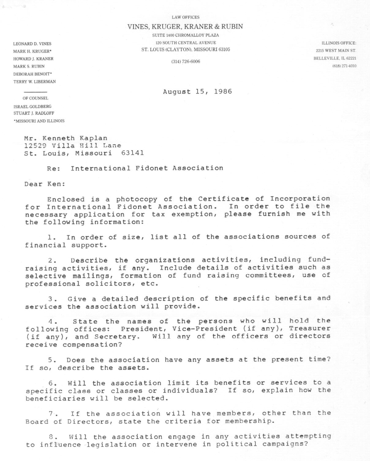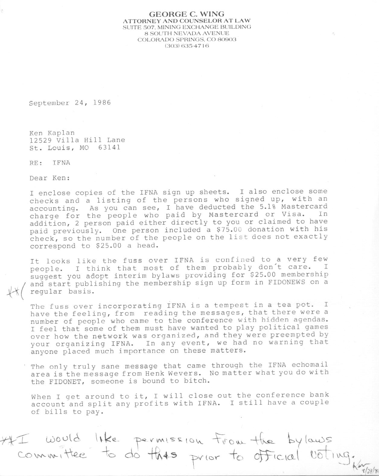| Letter from Attorney George C. Wing to Ken Kaplan Regarding FidoNet (September 24, 1986)
