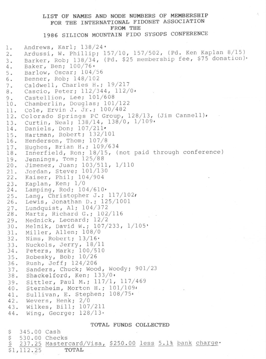 | List of Names and Node Numbers of Membership for the International Fidonet Association from the 1986 Silicon mountain Fido Sysops Conference