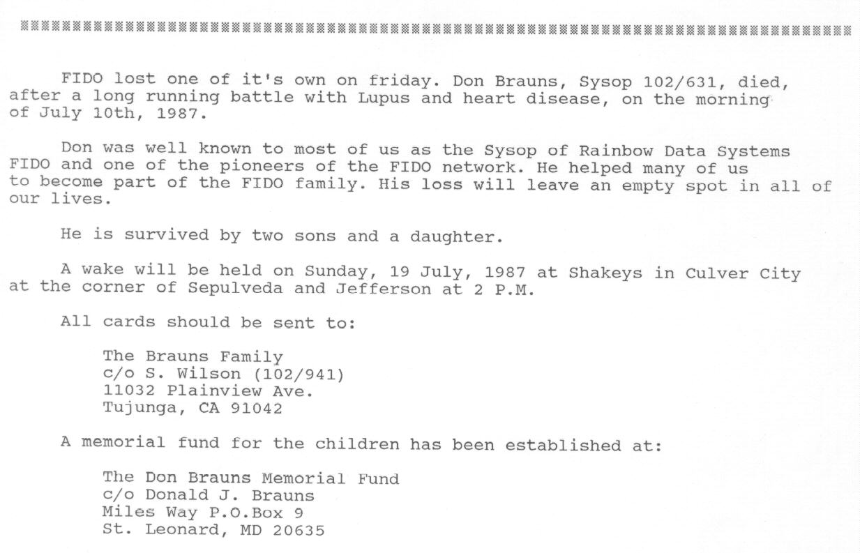 | Obituary for Fidonet Sysop Don Brauns (July, 1987)