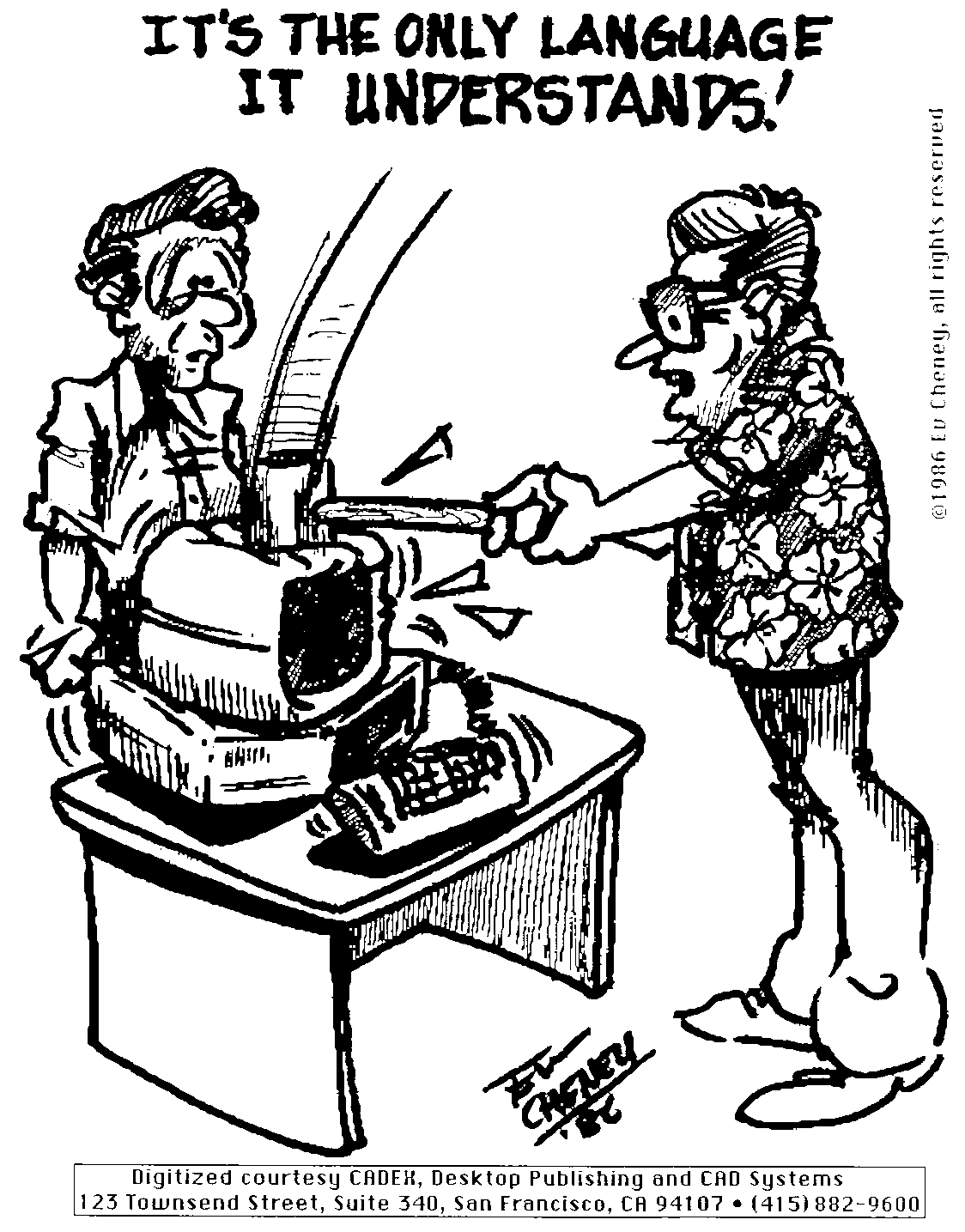 | Cartoon: "It's the Only Language It Understands!" by Ev Cheney (1986)