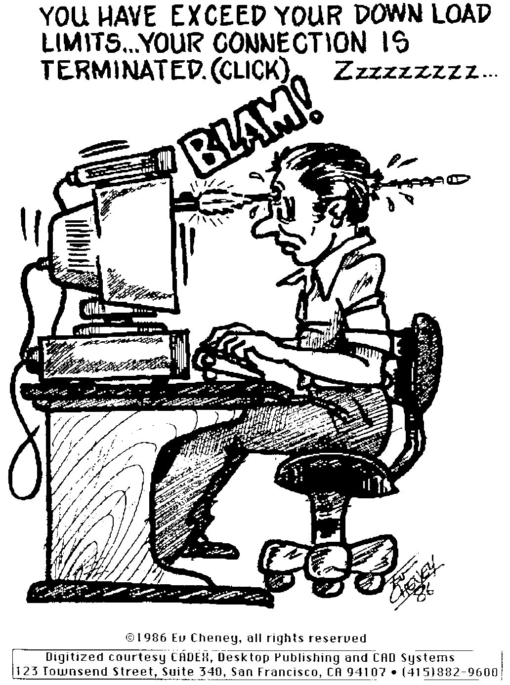 | Cartoon: "You Have Exceeded Your Download Limits" by Ev Cheney (1986)