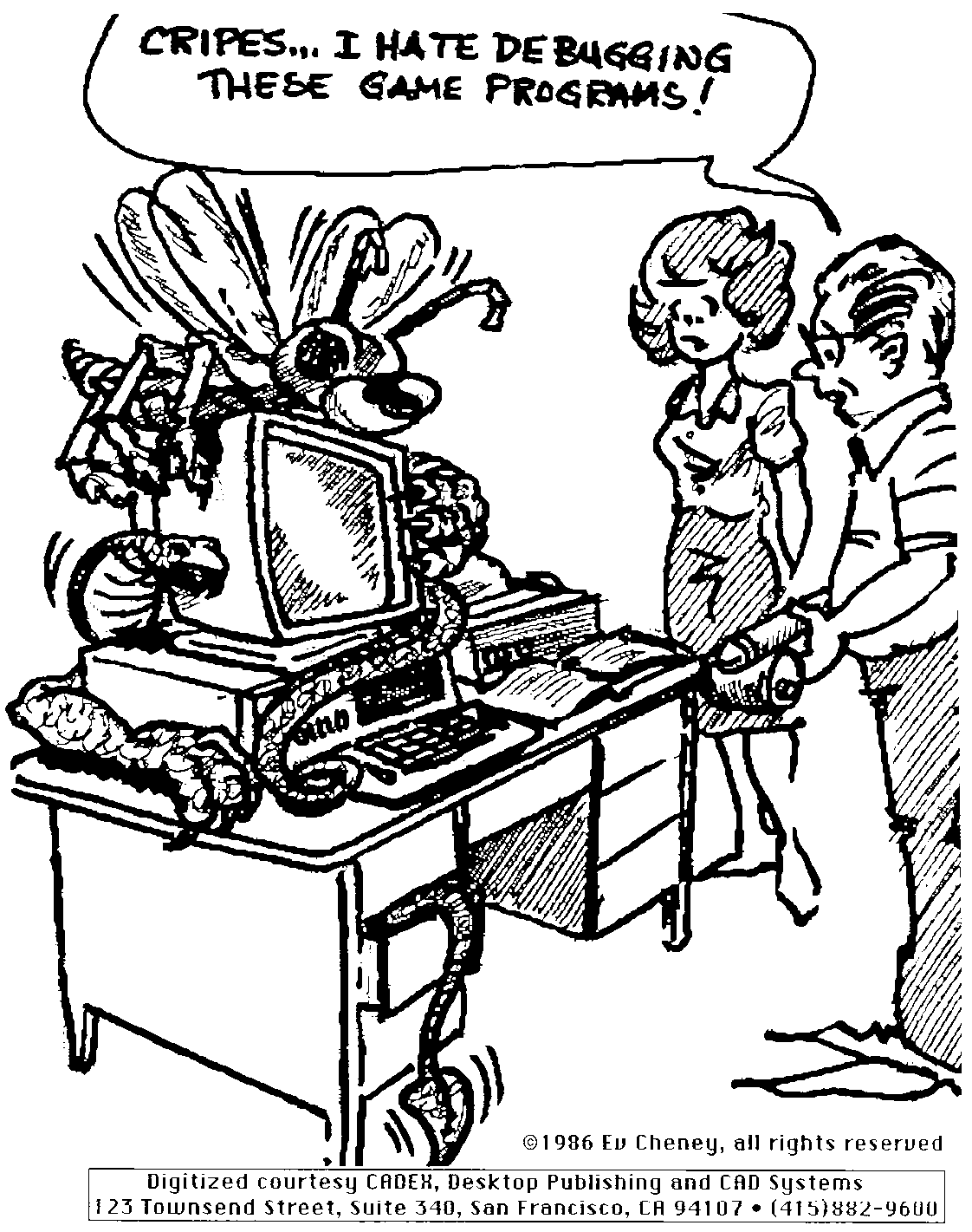 | Cartoon: "Cripes... I Hate Debugging These Game Programs!" by Ev Cheney (1986)